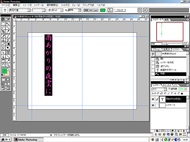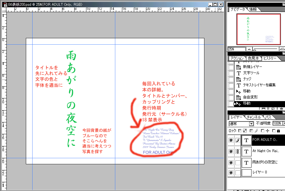 表紙つくり2 作っておいた原稿のテンプレを開きます。中央に十文字にデザインの位置を決めるガイドを入れ、全部の角の内側に1cmくらいガイドを引きます。たいたい周辺1cmくらいには文字や重要なデザインを入れないようにするためです。プリンターの特性にもよりますが、四隅まで印刷出来ることはまず、ないので。どっちにしろ、回りを断裁するので、少し中央よりになるようにしています。両脇はページ数が多い中綴じで製本すると、8ミリ~10ミリ近く断裁するので、そのぶん内側にレイアウトを寄せ気味にします。まずはタイトルを適当な書体で適当な位置に入れます。色も適当で。これはおおまかなデザインを考えるだけなので適当に。色は後で変えます。(この本はB6なので周辺のガイドスケールが少し違います)。表紙に書く文字を入れます。私は毎回裏表紙に本のタイトルとカップリング、ジャンルと通しナンバー、発行日とサークル名を入れます。あと18禁表示も。本当は裏じゃなくて表に入れないといけないんですが。 [0回]PR