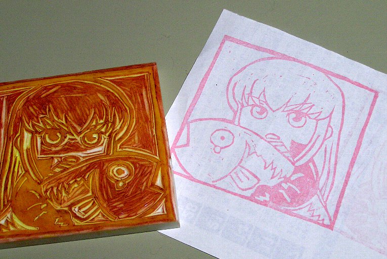剣帝さまおめでとうございます! …ということで、夕べ浮かれまくって原稿でなくこんなことしてました。(元絵を書いた人には許可貰ってますので念のため)元絵を大きく印刷しすぎてハンコが大きすぎです。もっと小さくしたほうが押しやすかったかも…。大きすぎて修正と綺麗に押すのがすごく大変でした。もっと小さいほうが扱いやすいと思うので作り直すか…>原稿しろ所要時間は3時間半くらい。掘った時間だけなら3時間弱ですね。 [3回]